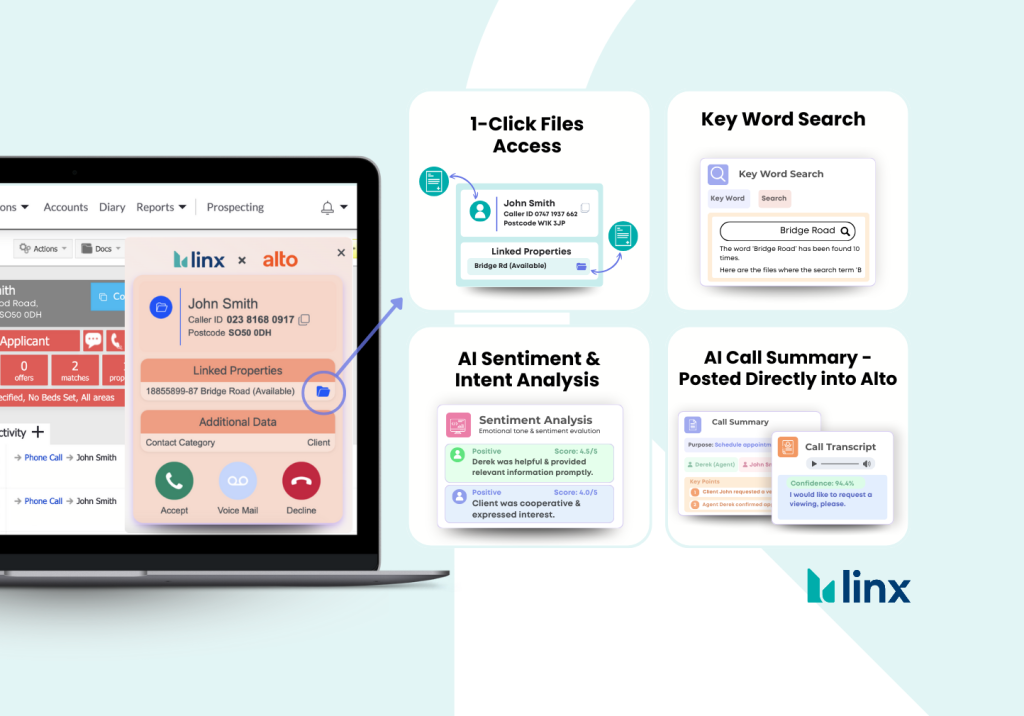 Linx seamlessly integrates with Alto to enhance every phone call. It identifies callers instantly, displaying linked property and contact details before you answer. Every call is automatically transcribed and summarised by AI, with notes logged directly in Alto.